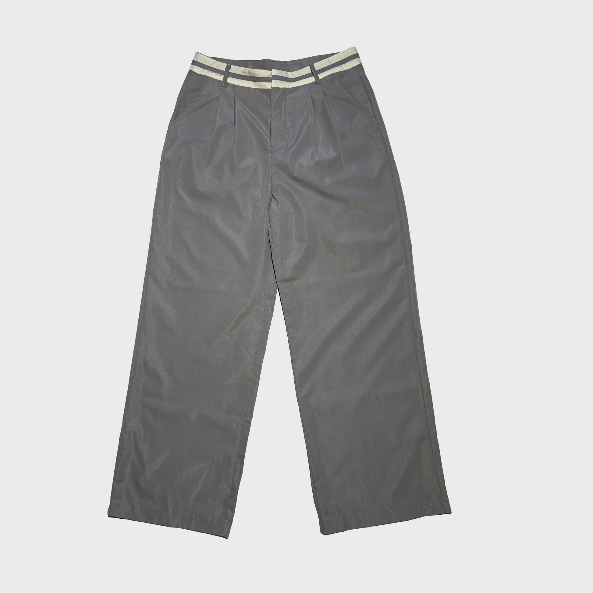Modern gray trousers with a subtle sheen and wide legs, finished with a sporty striped waistband for a fresh, urban touch.