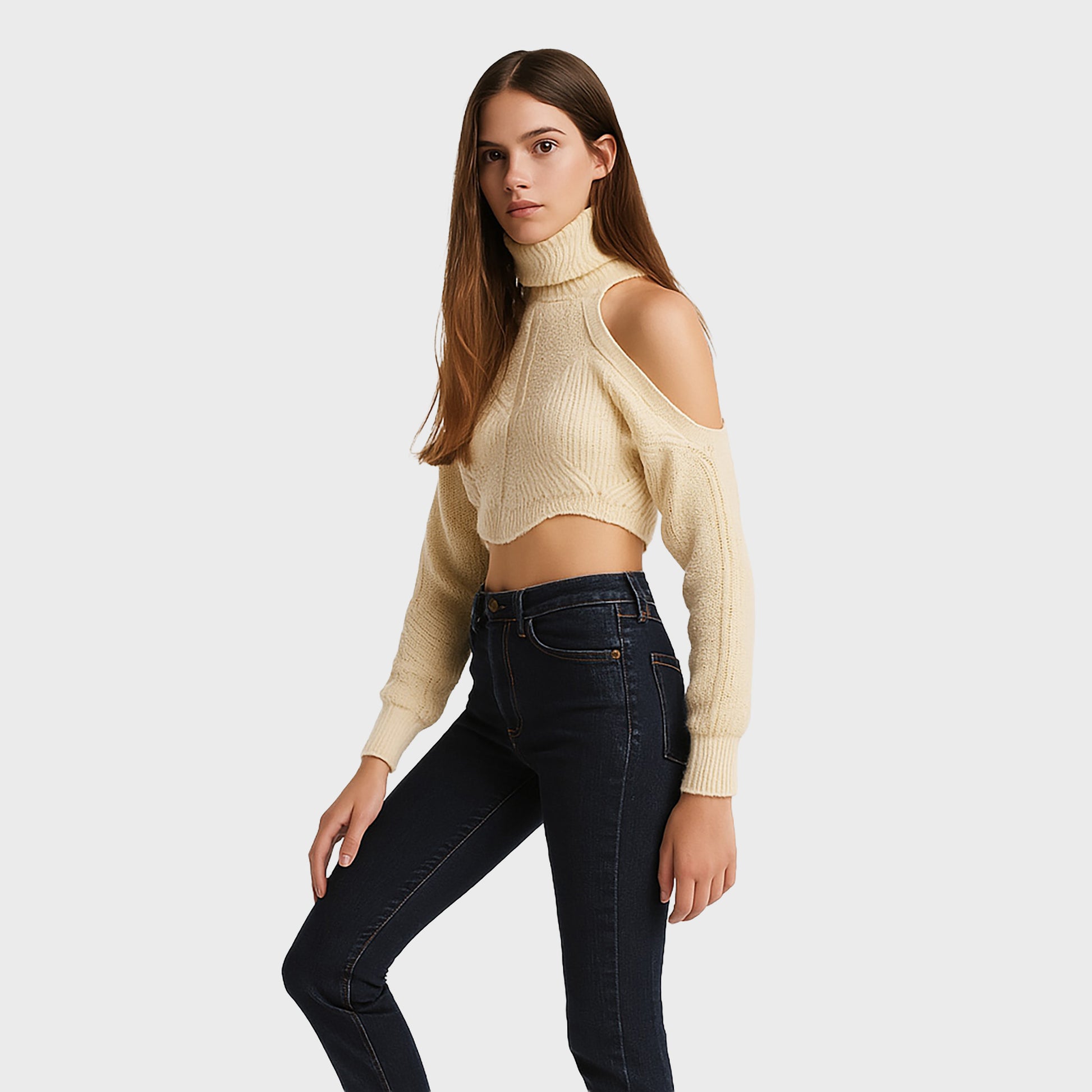 Blusa beige corta manga larga cuello alto