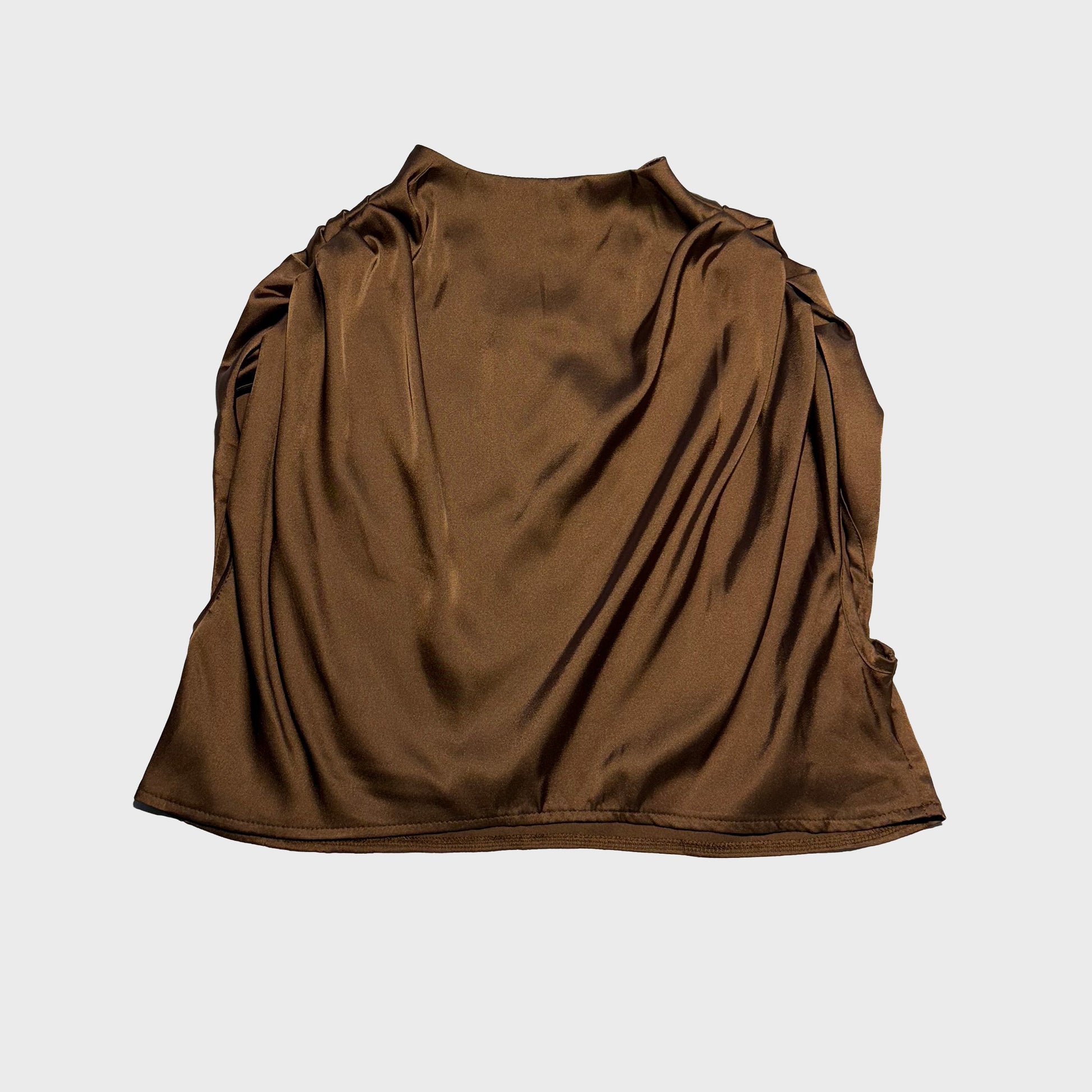Un lujoso top marrón satinado con drapeado fluido y brillo suave, perfecto para eventos nocturnos o combinado con pantalones sastre para un estilo elegante y minimalista.