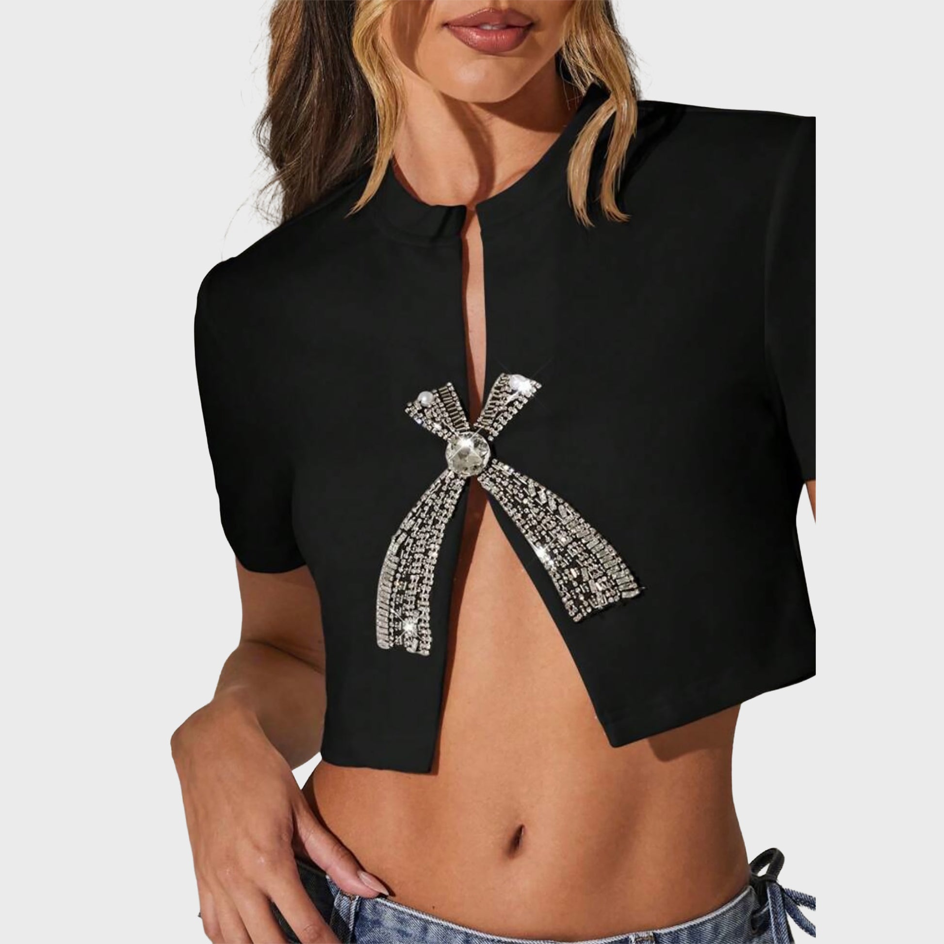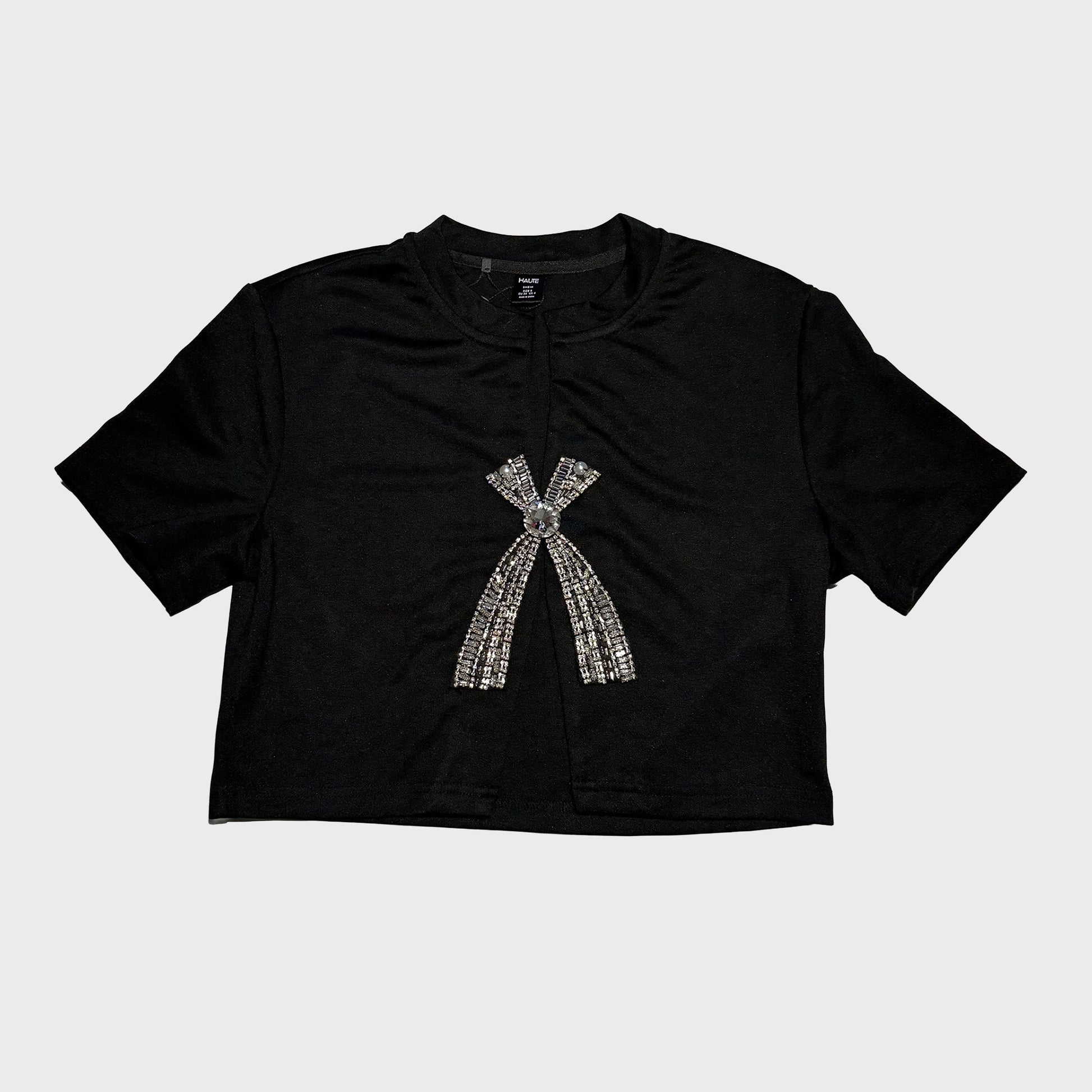 Esta blusa negra corta con lazo de diamantes es perfecta para destacar tu estilo único. Su diseño moderno y elegante la convierte en una prenda ideal para cualquier ocasión.
