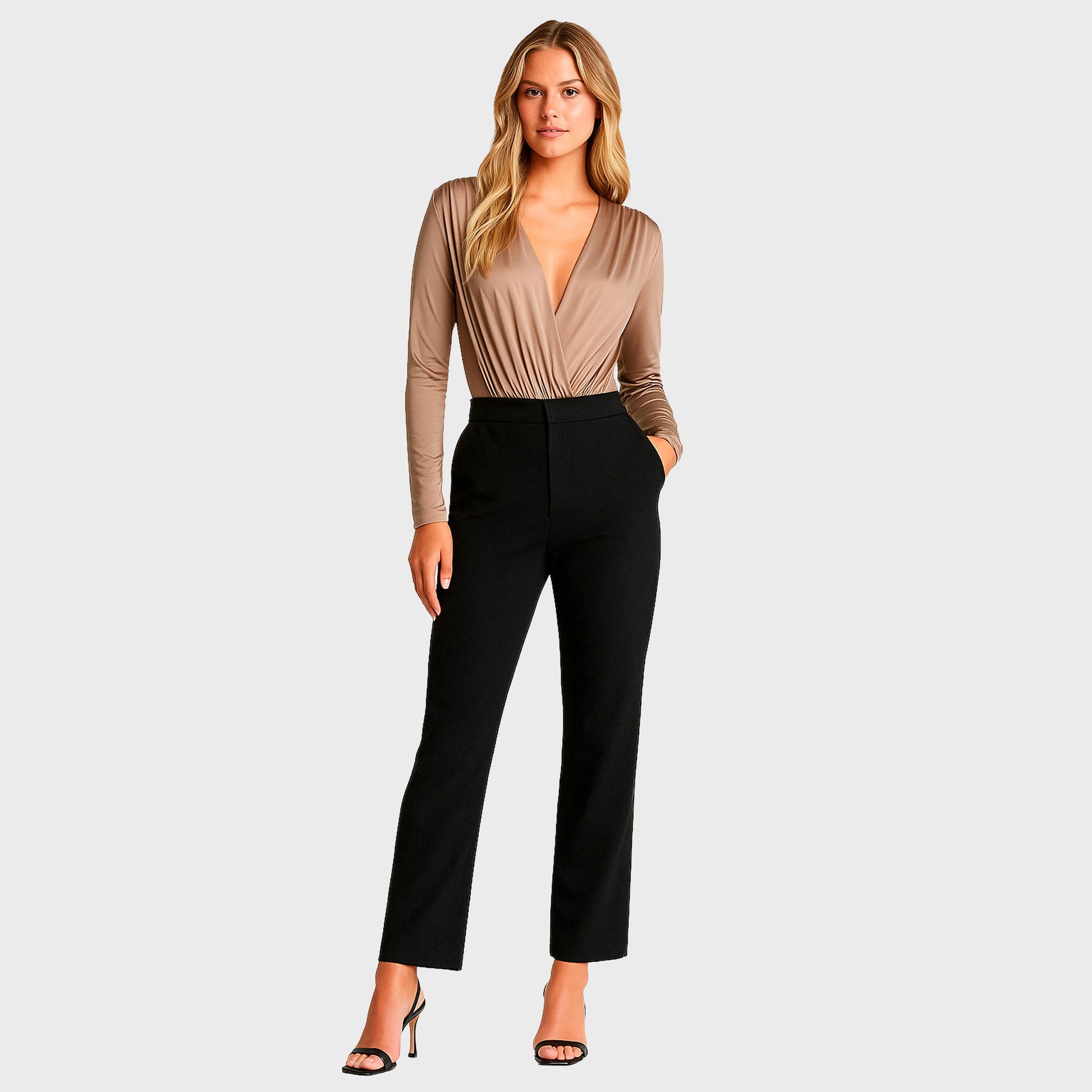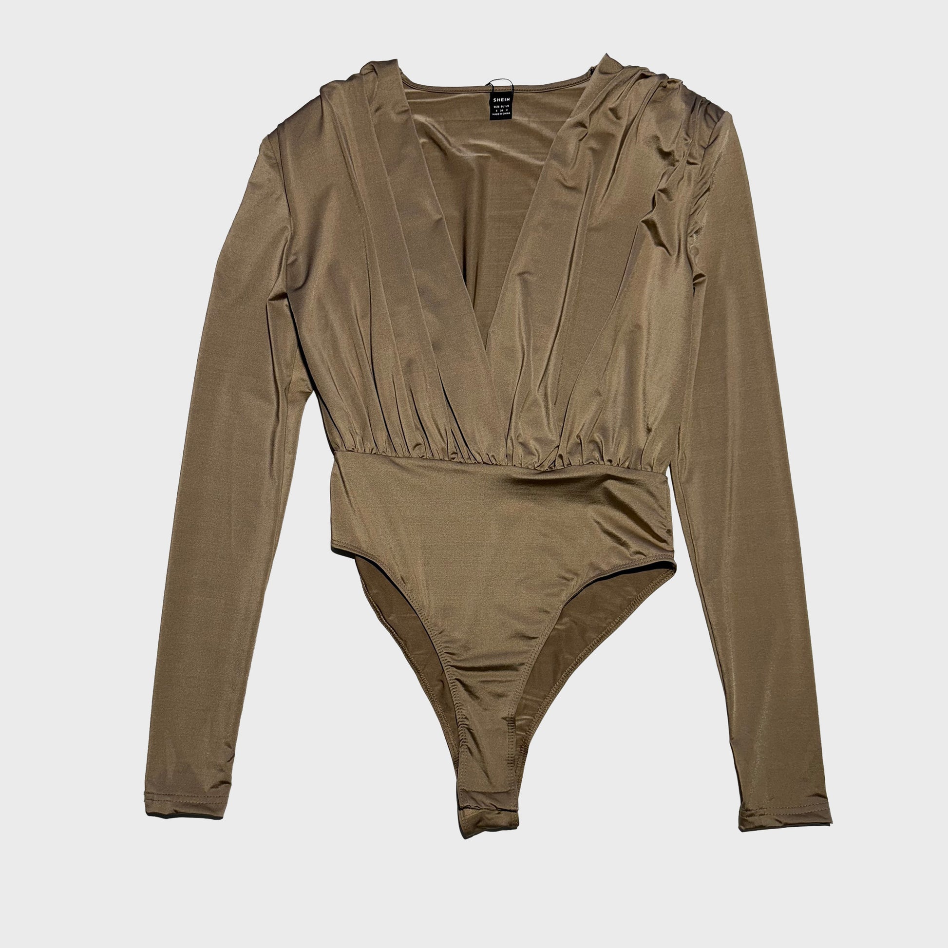 Este body beige satinado manga larga realza tu figura con elegancia y sofisticación. Perfecto para combinar con tus prendas favoritas de cada de noche.