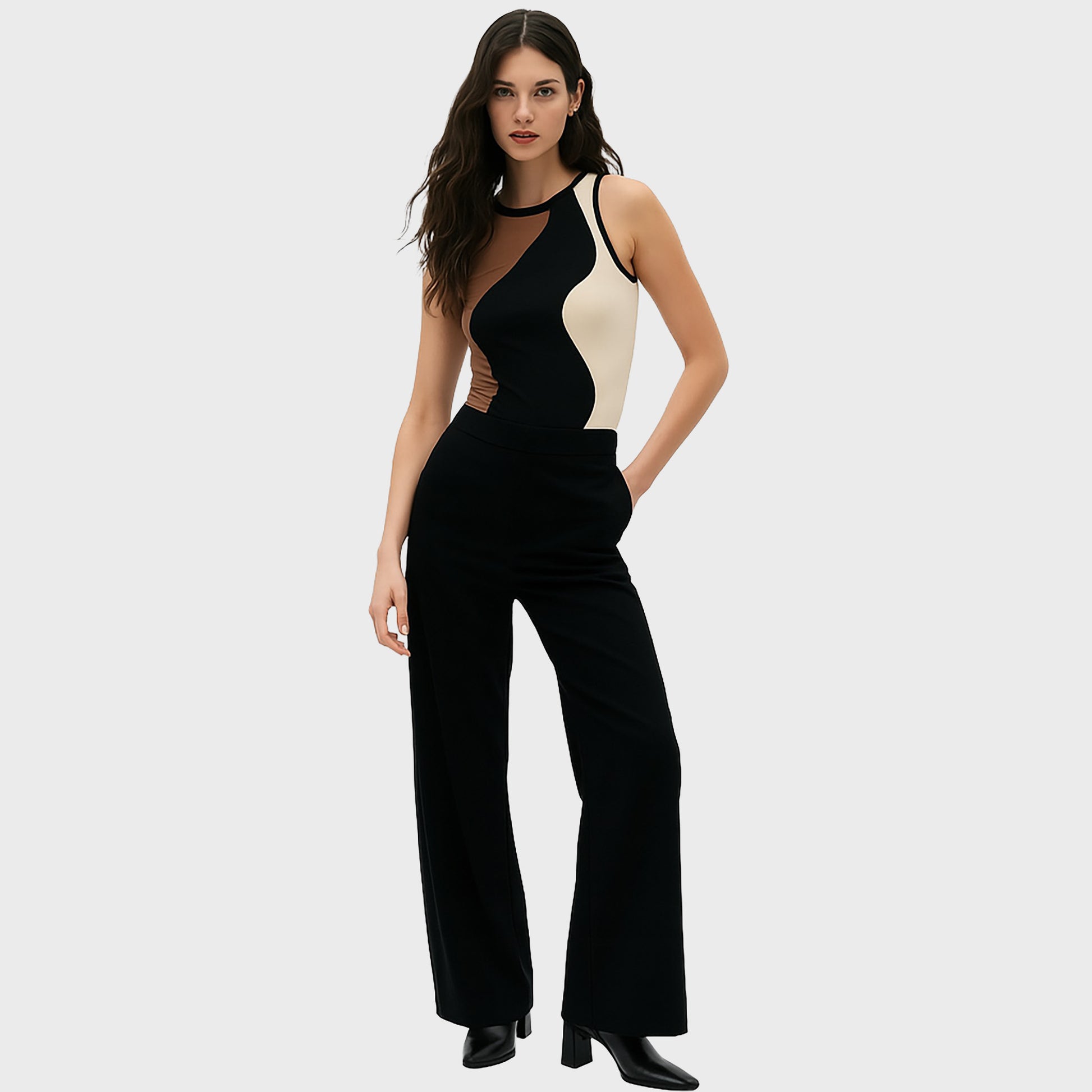 Divertido y moderno, este body sin mangas presenta un diseño de paneles ondulados en tonos beige, negro y marrón. Una pieza única con bloques de color para energizar tu look.