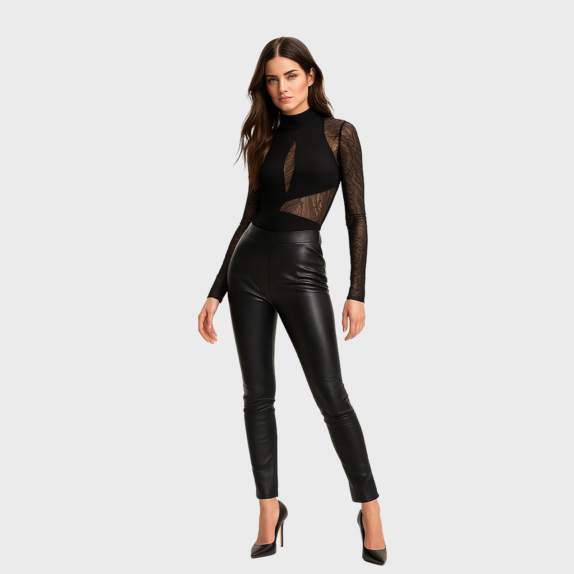 Este body negro de manga larga combina elegancia y modernidad con su diseño ajustado y paneles transparentes estratégicamente ubicados. La estructura en V profunda realza la silueta, ofreciendo un equilibrio perfecto entre opacidad y textura para un look sofisticado y atrevido. Ideal para quienes buscan una prenda versátil que destaque con estilo y confianza.