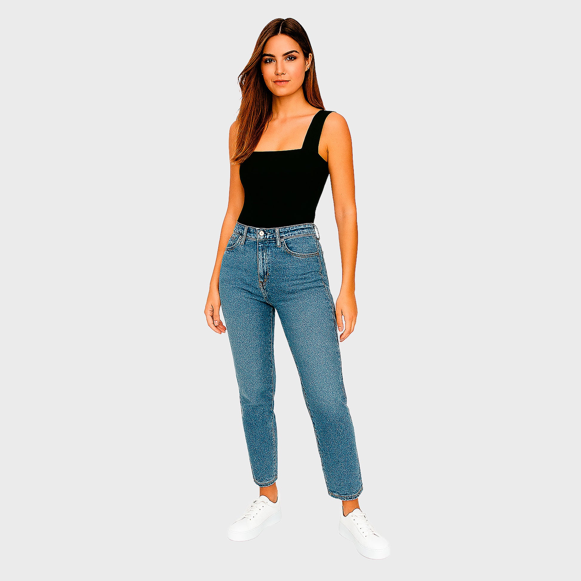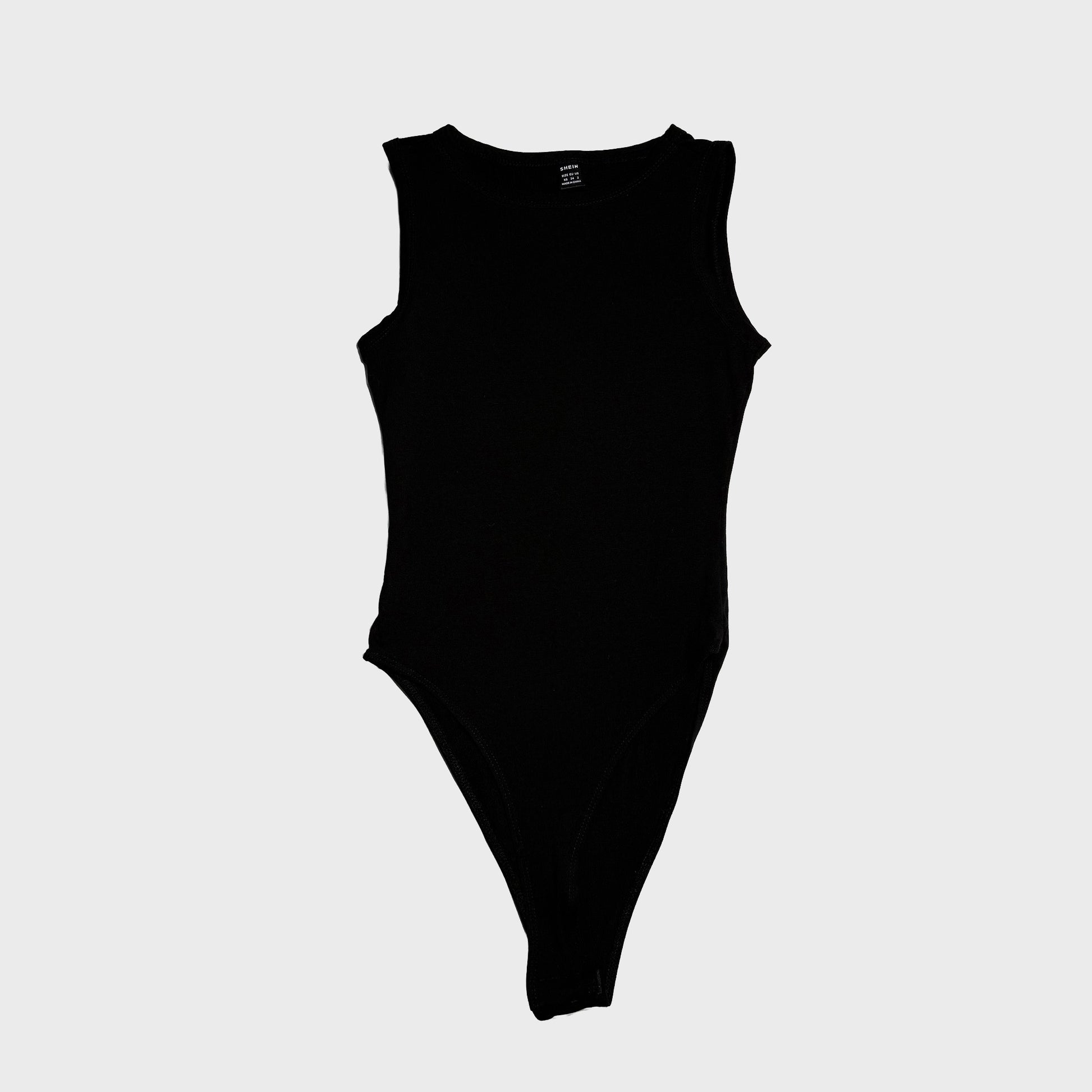 Este body negro sin mangas está diseñado con un escote alto y una silueta minimalista. Perfecto para capas aerodinámicas o estilos individuales.