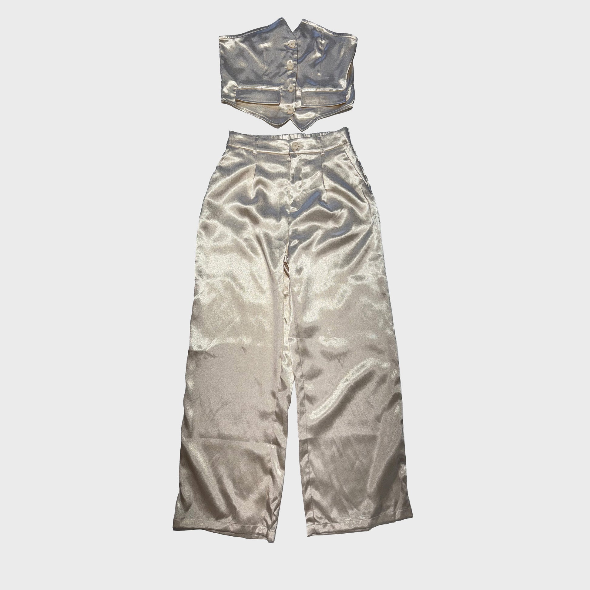 Glamuroso y lujoso, este conjunto de satén de dos piezas incluye un top estructurado estilo corsé y pantalones de pierna ancha en un suave tono champán. Ideal para ocasiones nocturnas.
