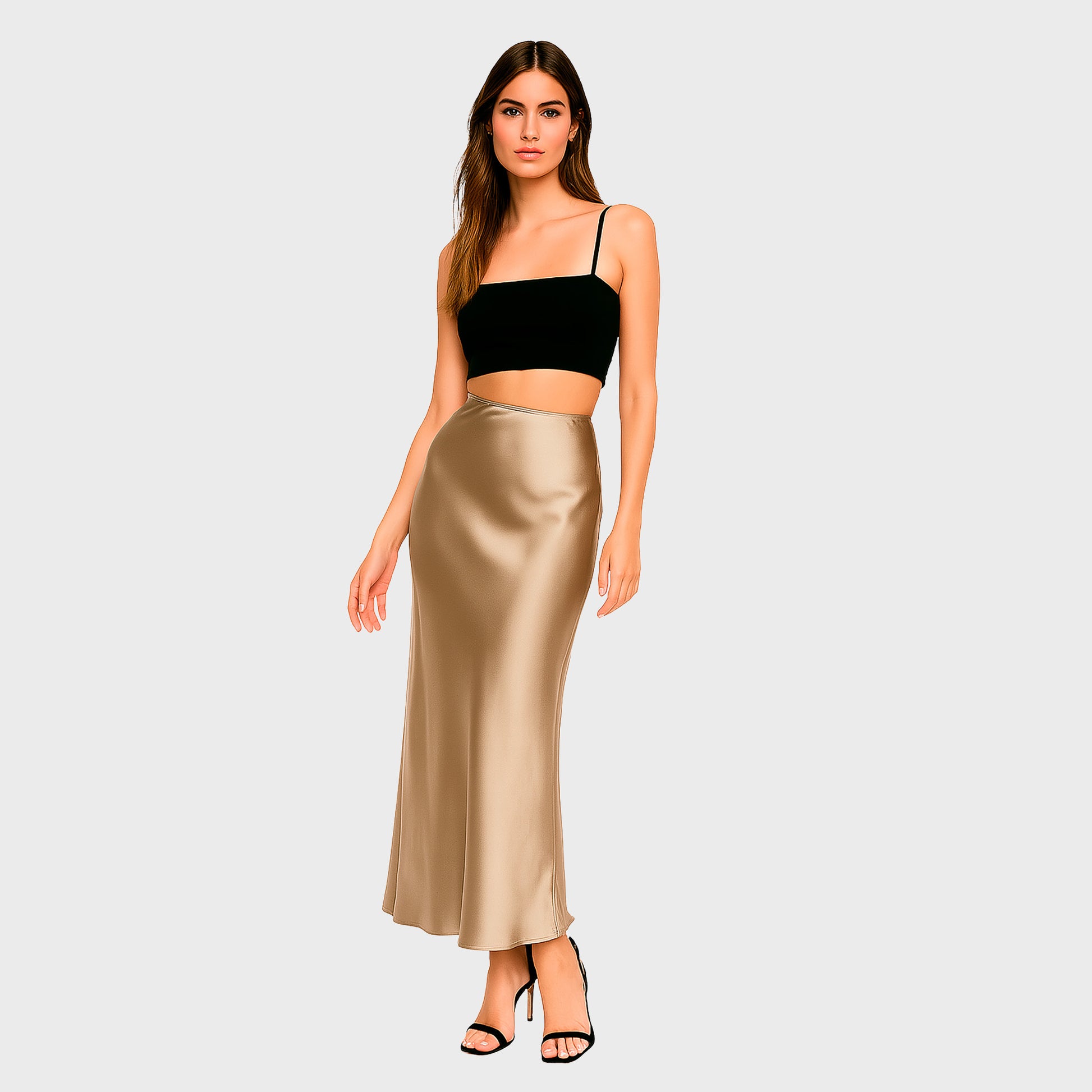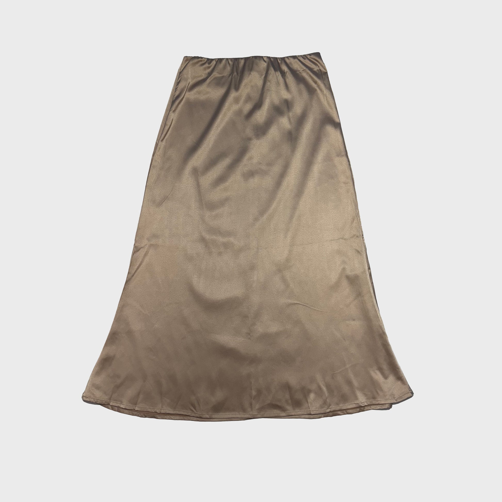 Elegante y suave, esta falda mini de satén beige fluye con un brillo sutil y una favorecedora forma, Un básico atemporal para el día o la noche.