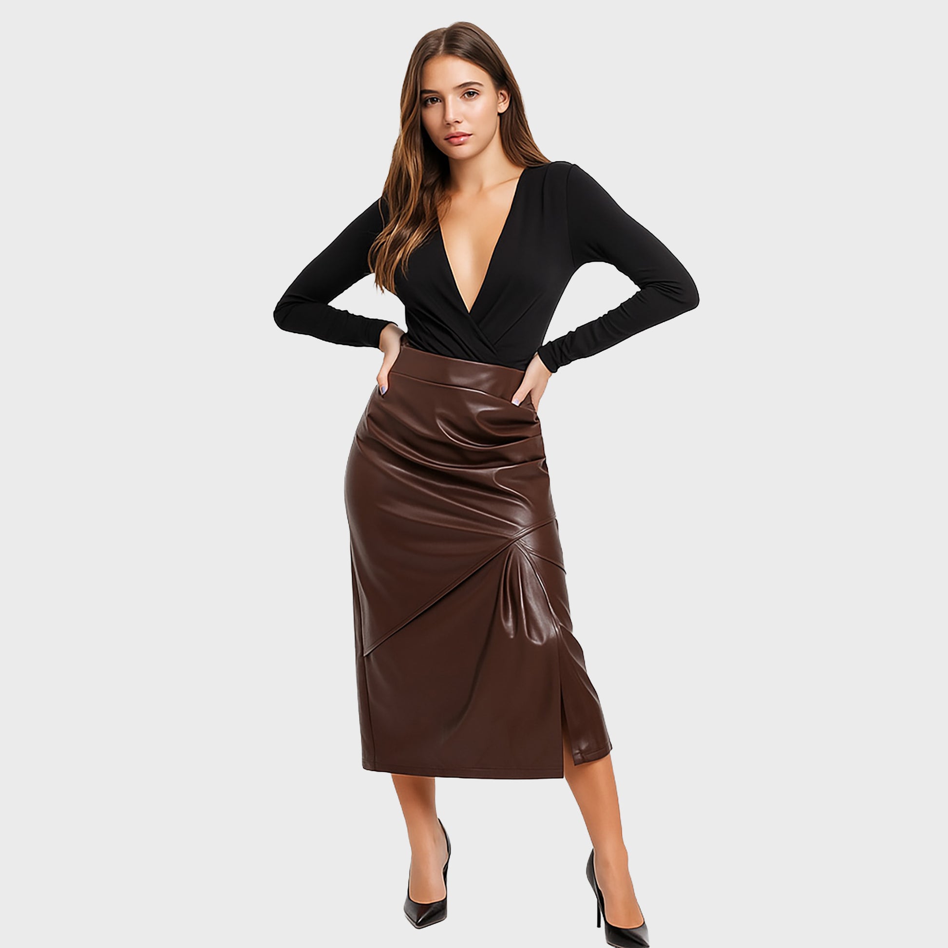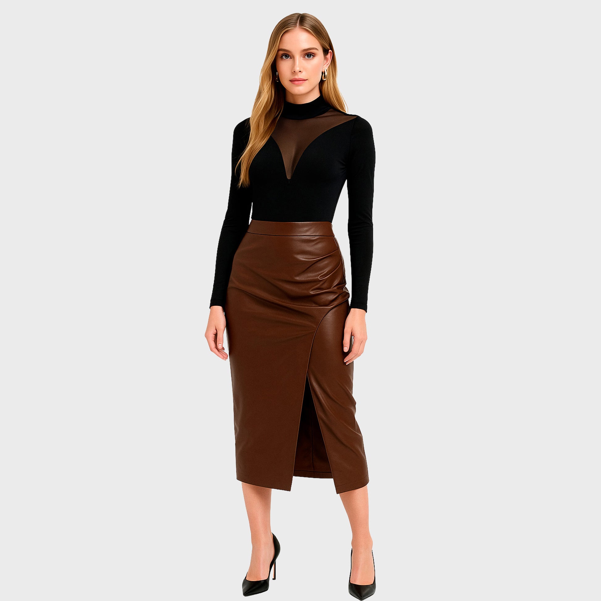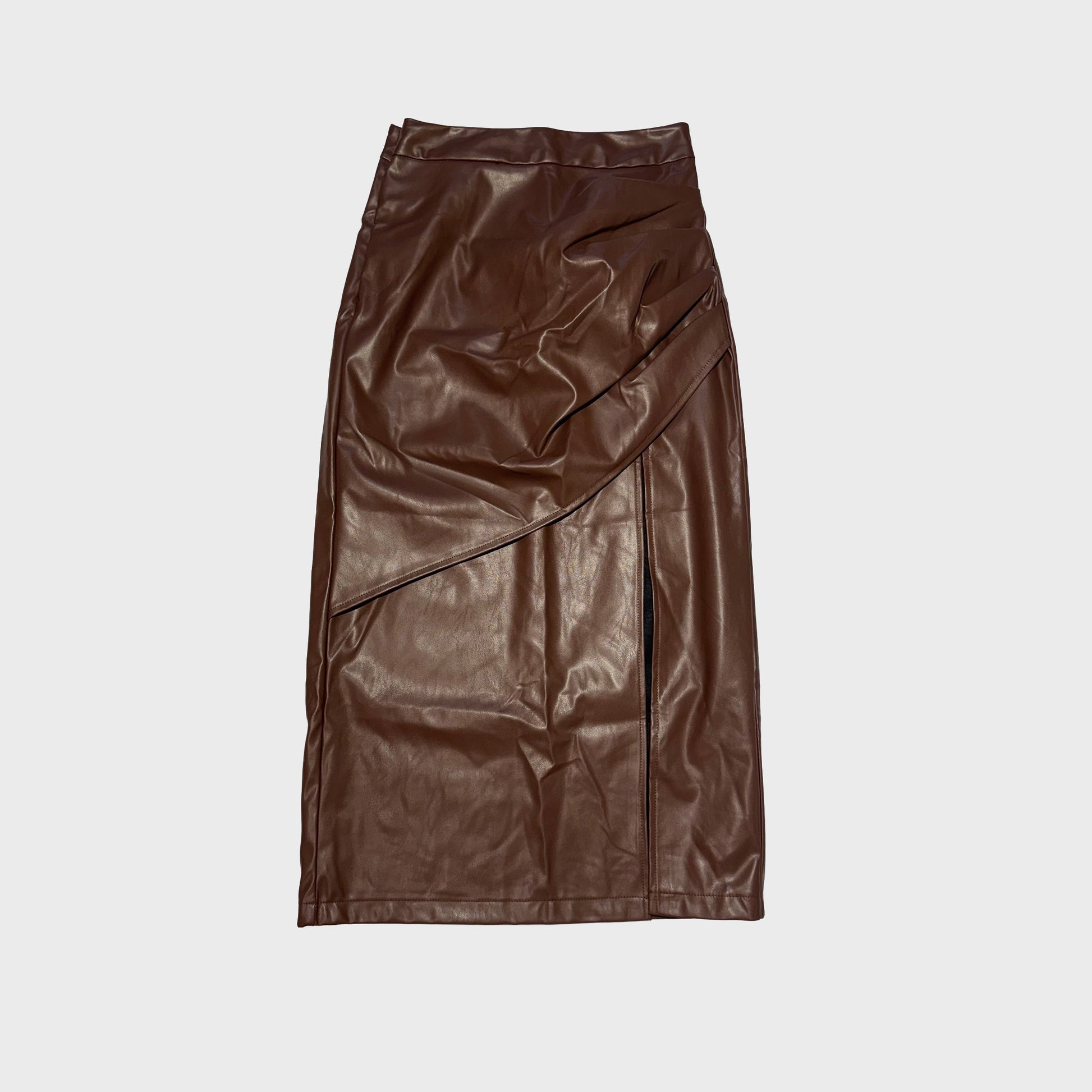 Haz una declaración de intenciones con esta falda midi de piel sintética marrón con un diseño superpuesto asimétrico. La textura audaz se combina con la sofisticación moderna.