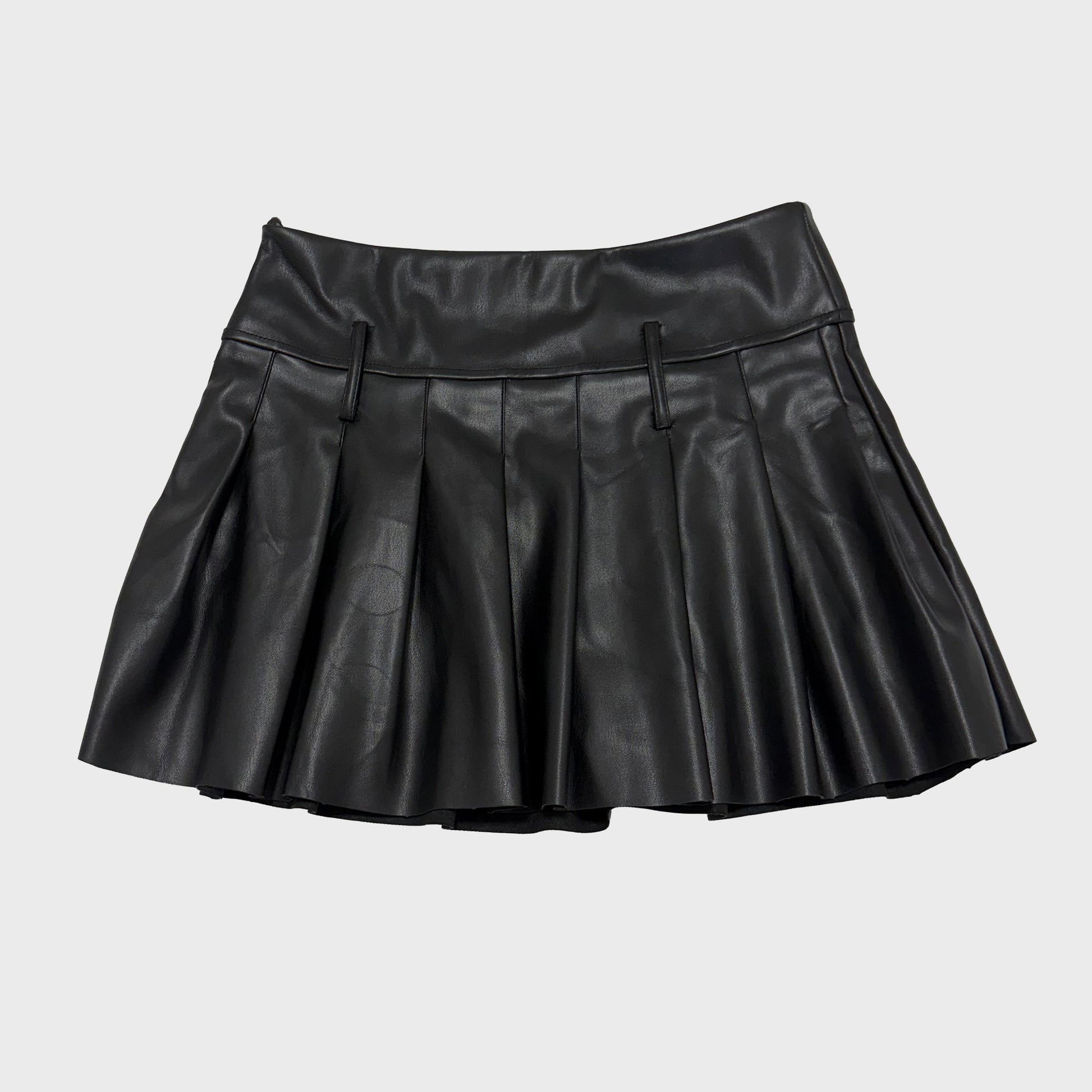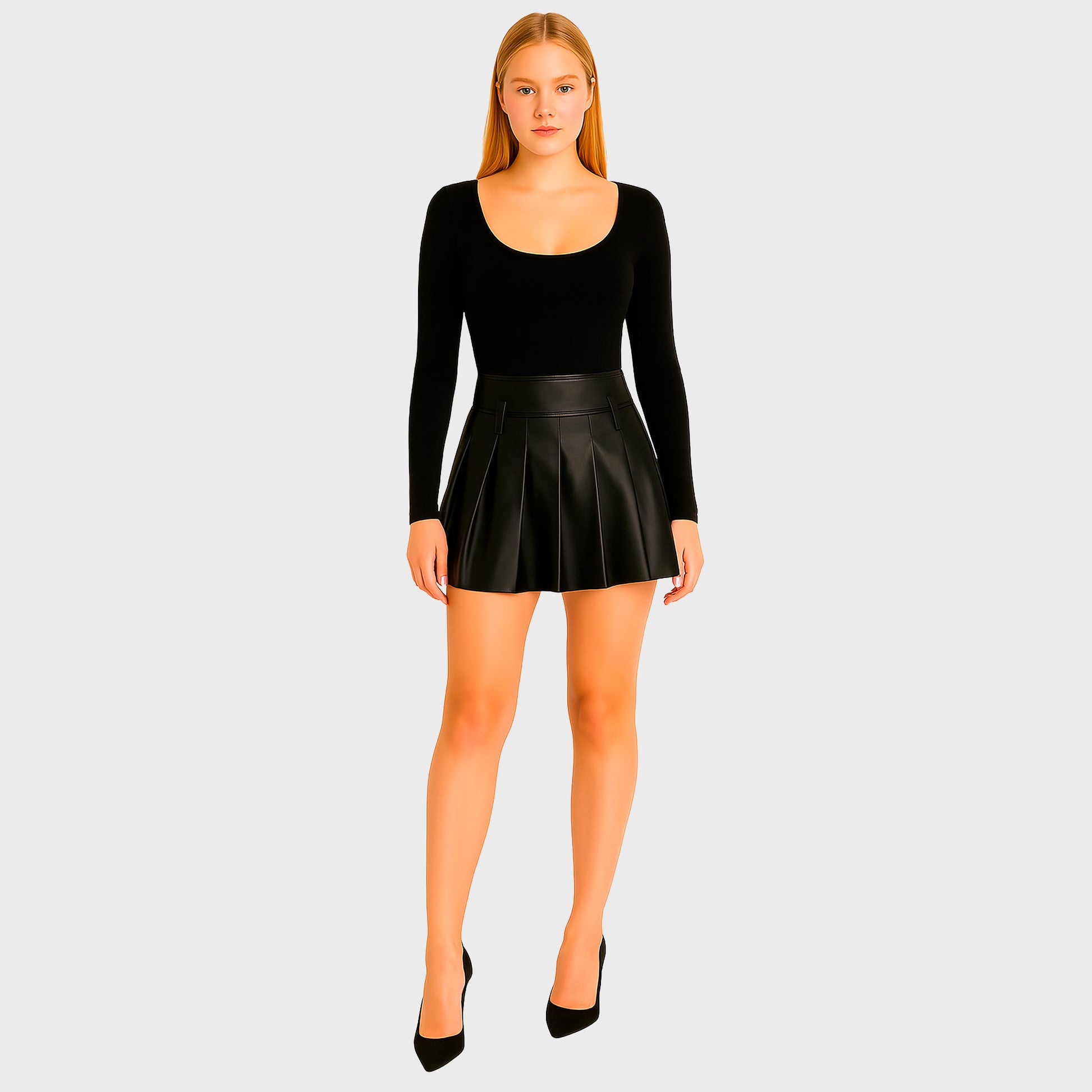 Esta falda mini de cuero con plise es una pieza clave en tu armario. Aporta un toque femenino y chic a tu outfit diario.