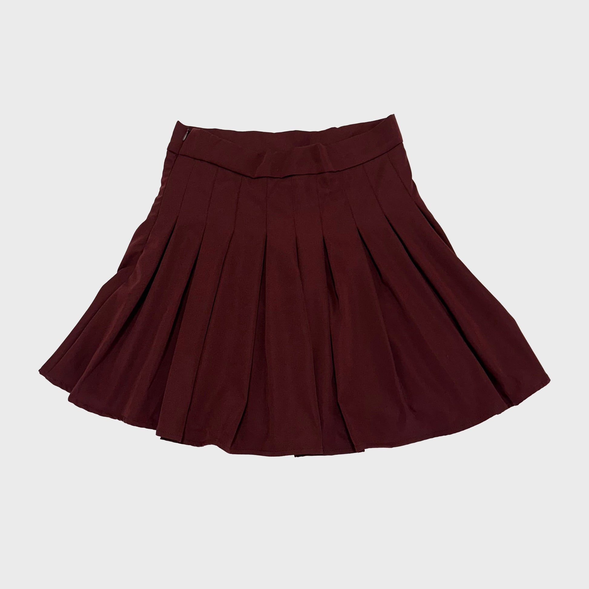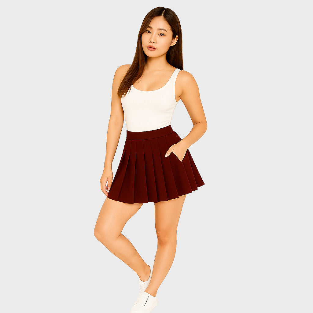 Esta falda mini Vinotinto con plise es una pieza clave en tu armario. Aporta un toque femenino y chic a tu outfit diario.