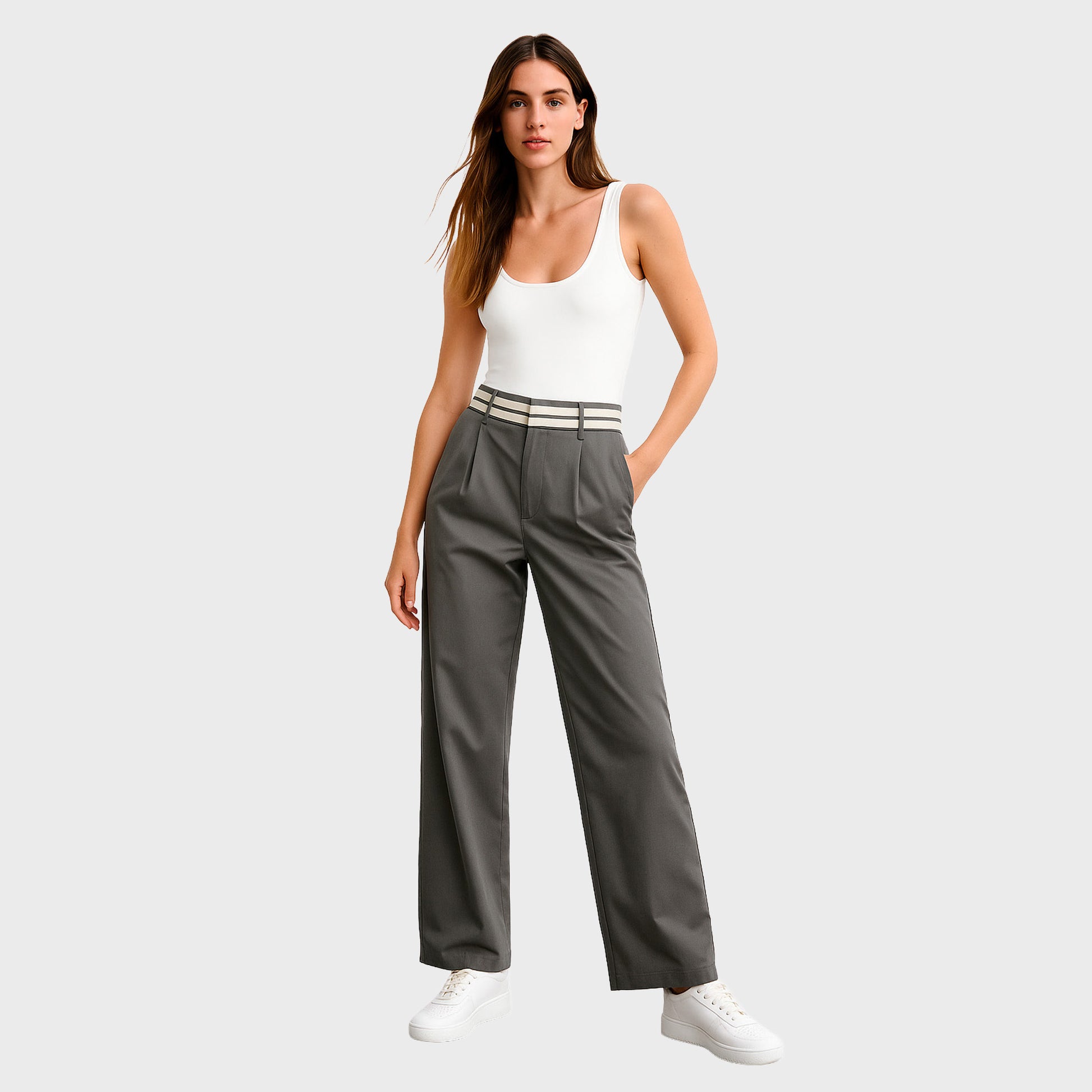 Pantalón gris moderno con un brillo sutil y perneras anchas, rematado con una cinturilla deportiva de rayas que le da un toque fresco y urbano.