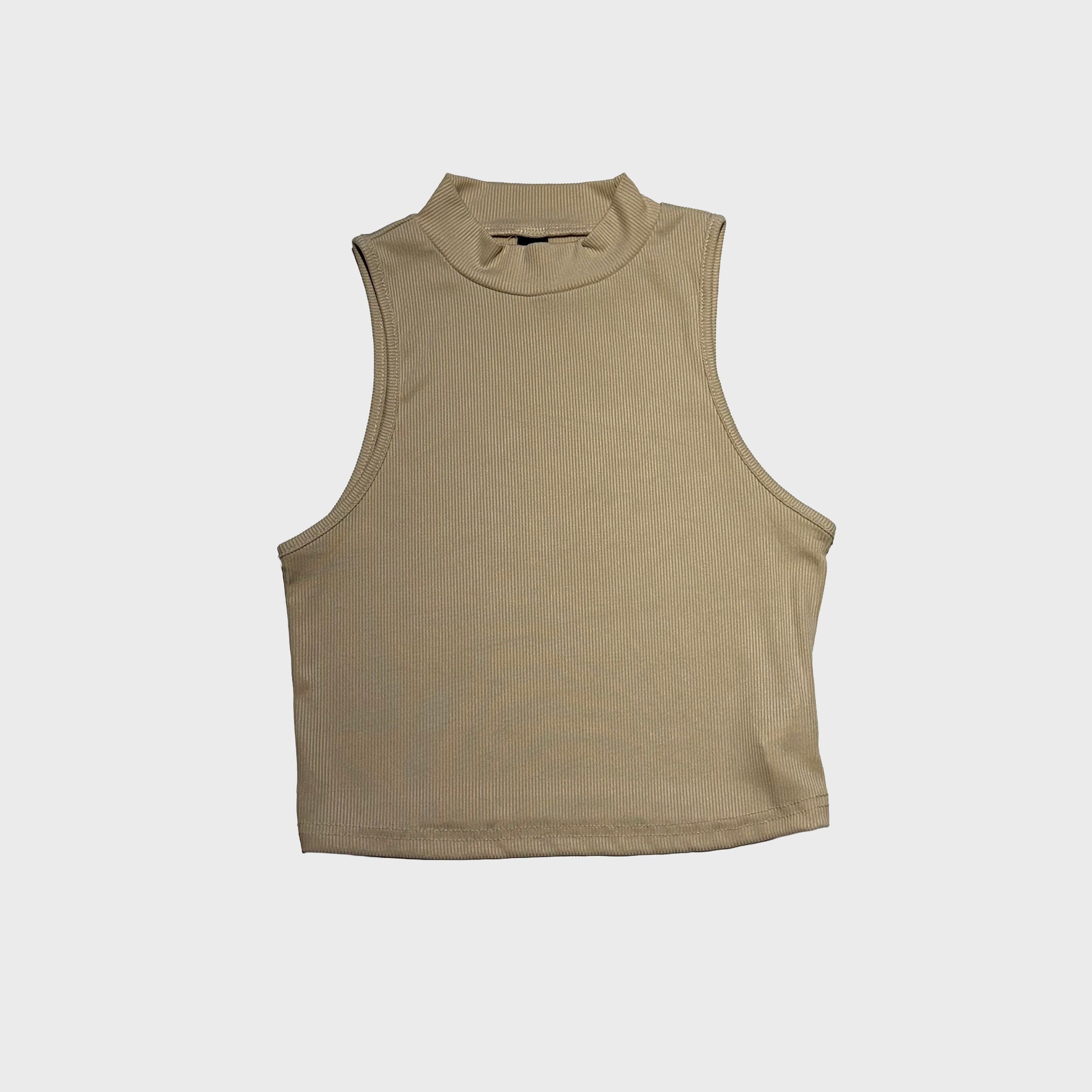 Top corto sin mangas en color beige con textura acanalada y cuello subido. Versã¡til y perfecto para combinar con pantalones de tiro alto.