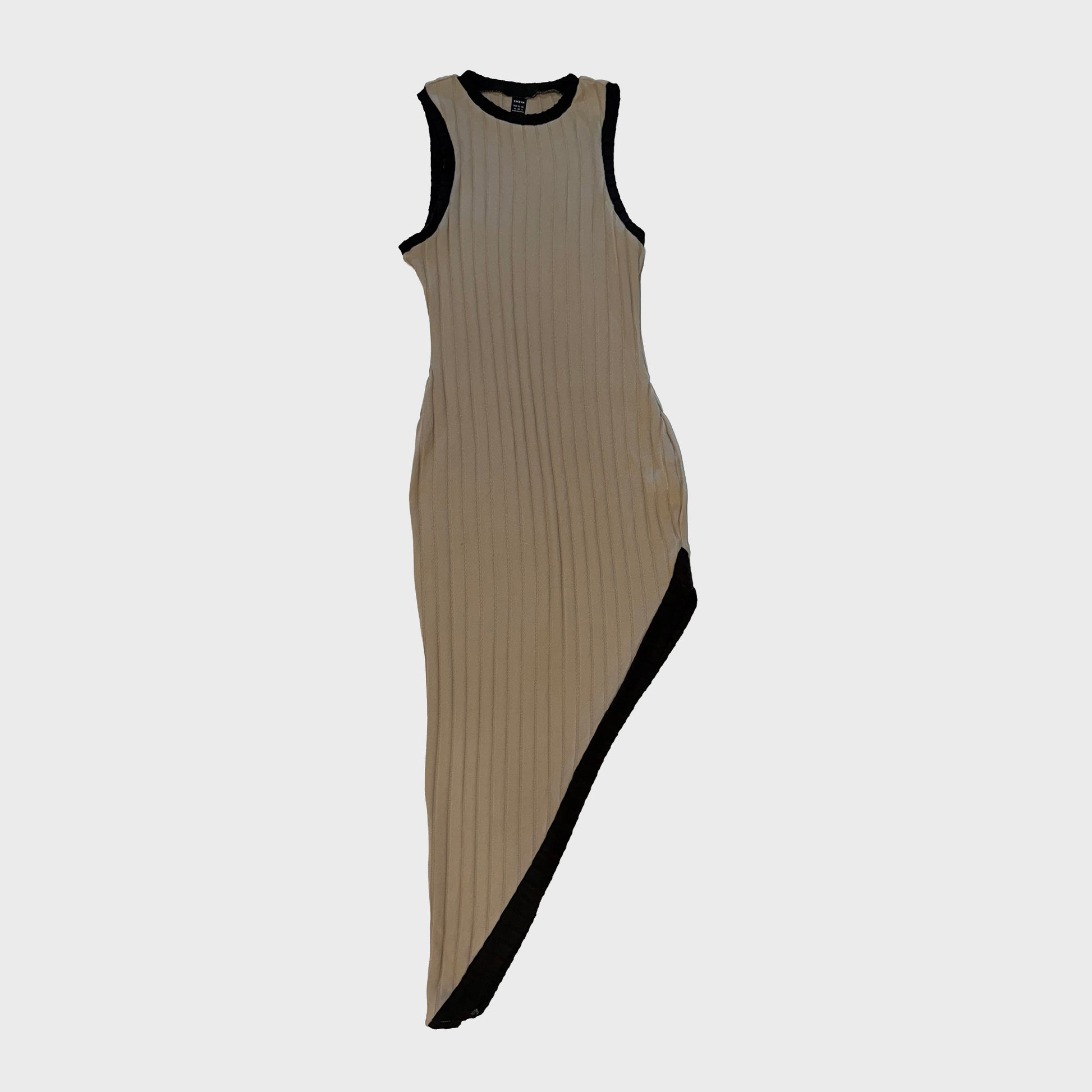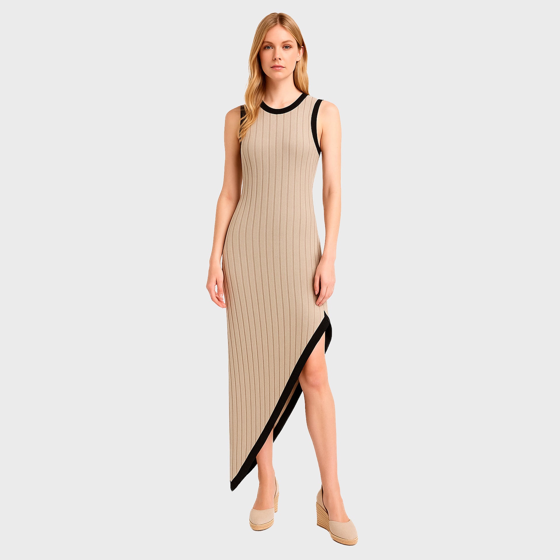 Vestido beige asimà trico©sin mangas con textura acanalada y ribetes negros. Corte moderno que realza la figura.