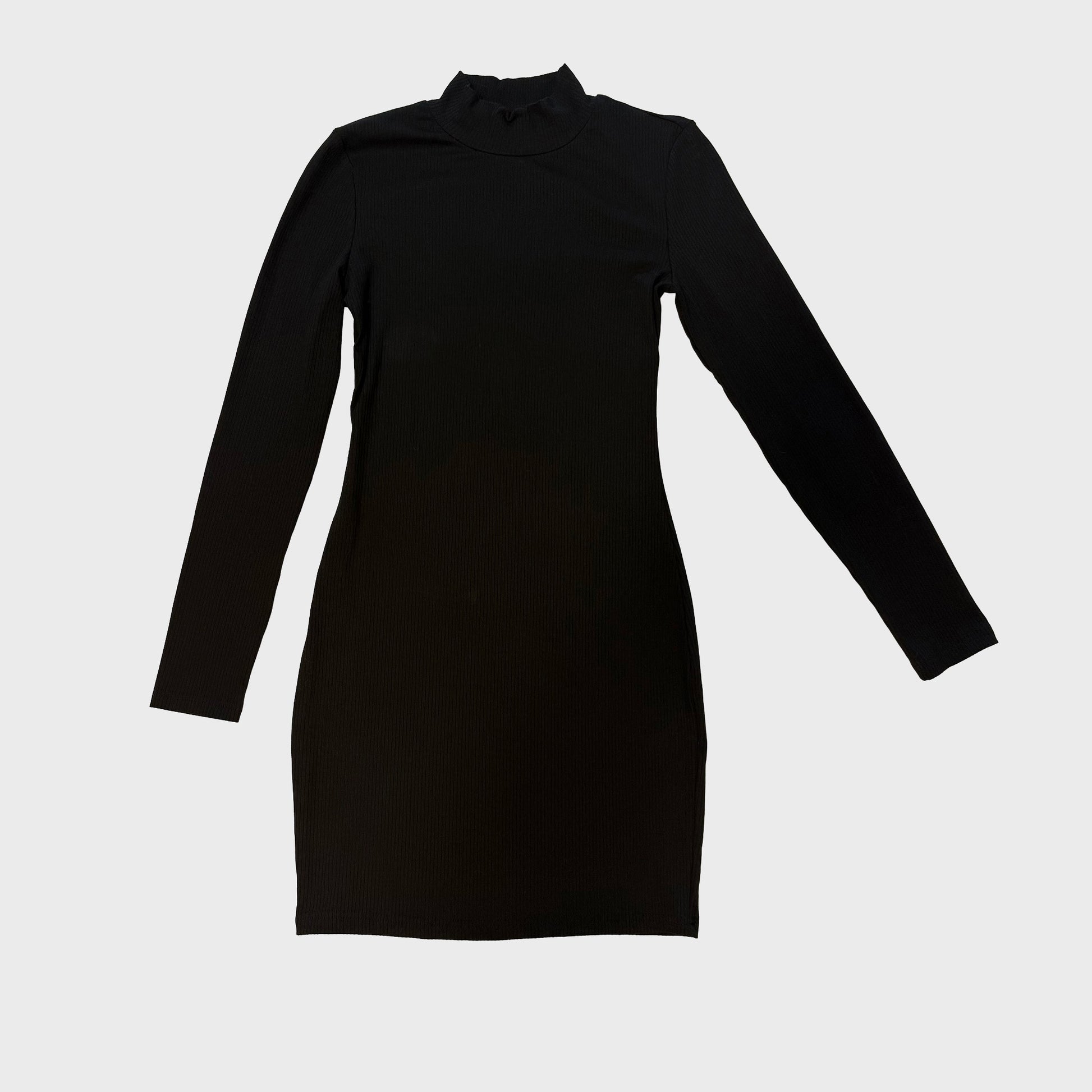 Vestido corto negro de manga larga con cuello subido. Corte limpio y elegante, perfecto para un estilo sofisticado.