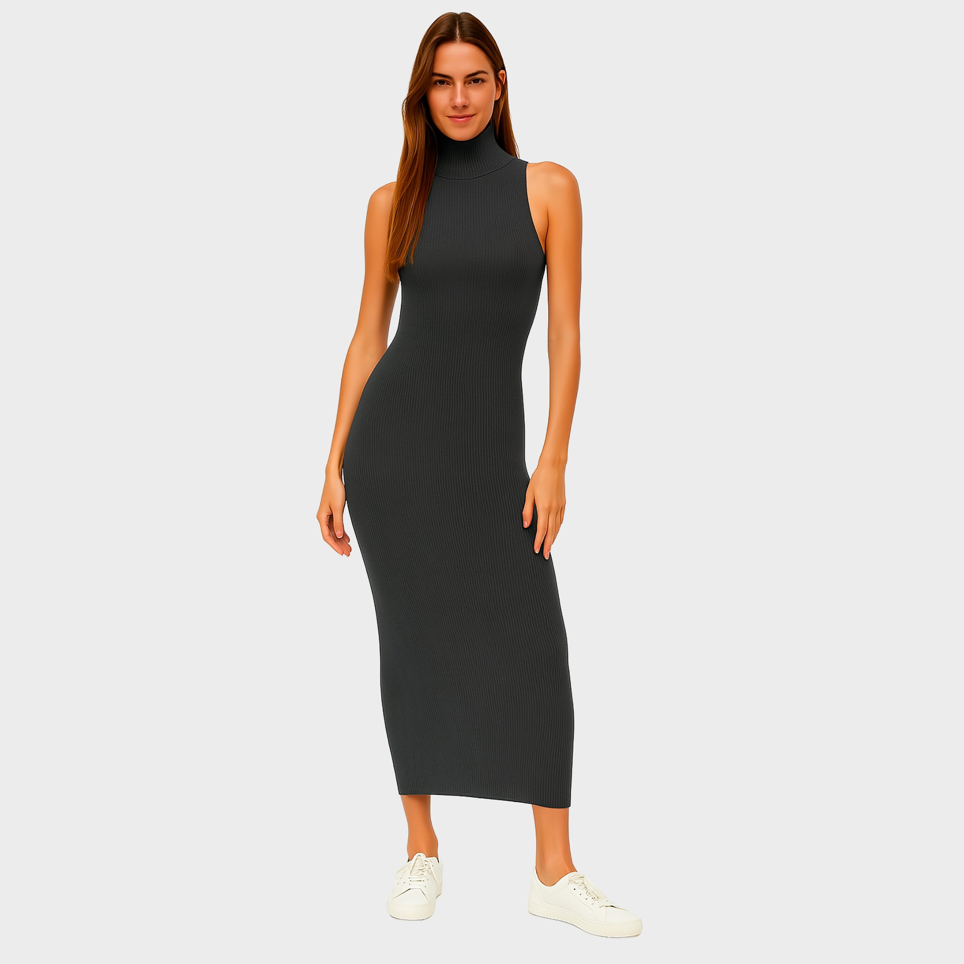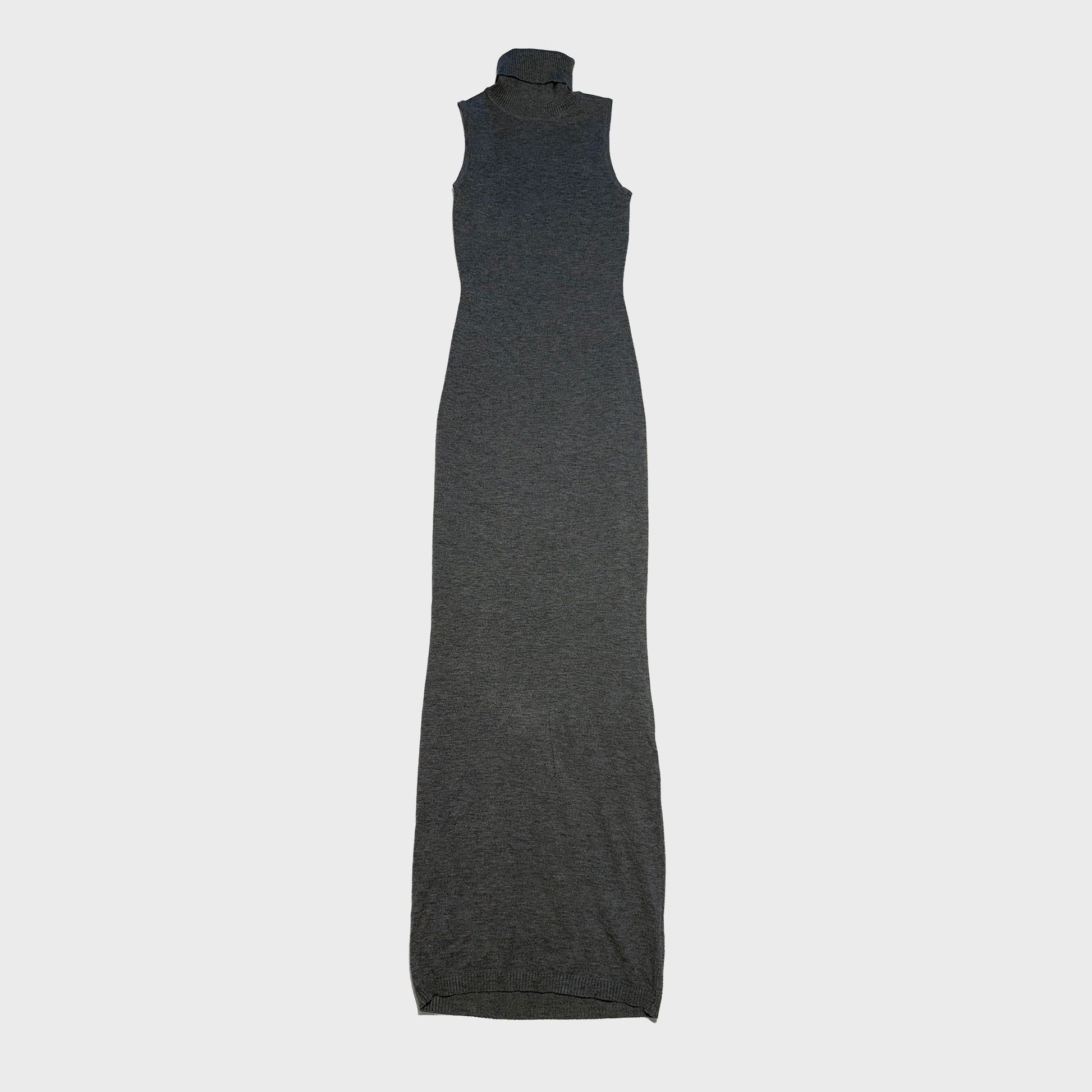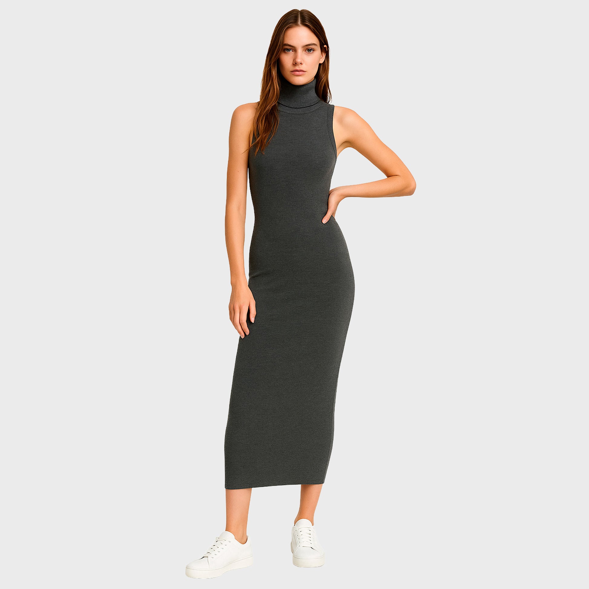 Este vestido gris largo cuelo alto es una prenda imprescindible para tu guardarropa. Su diseño combina elegancia y estilo para cualquier ocasión.