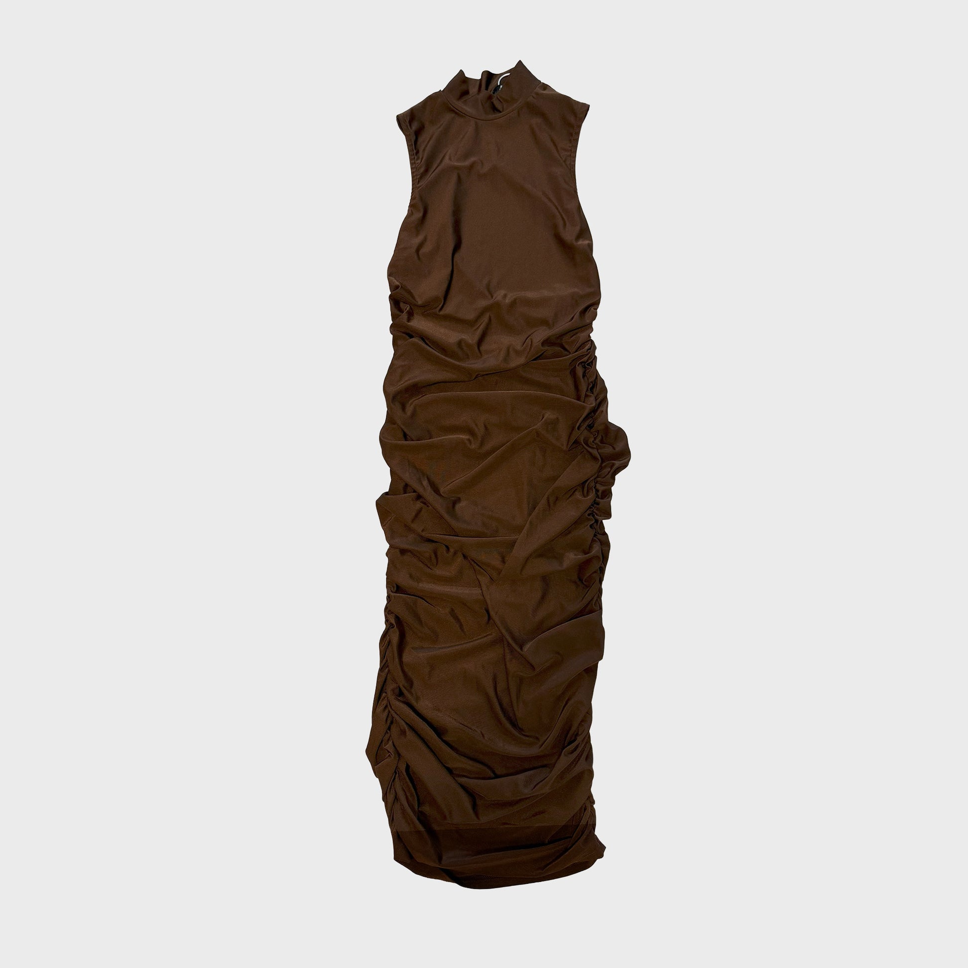 Este vestido marron arruchado a los lados es una prenda imprescindible para tu guardarropa. Su diseño combina elegancia y estilo para cualquier ocasión.