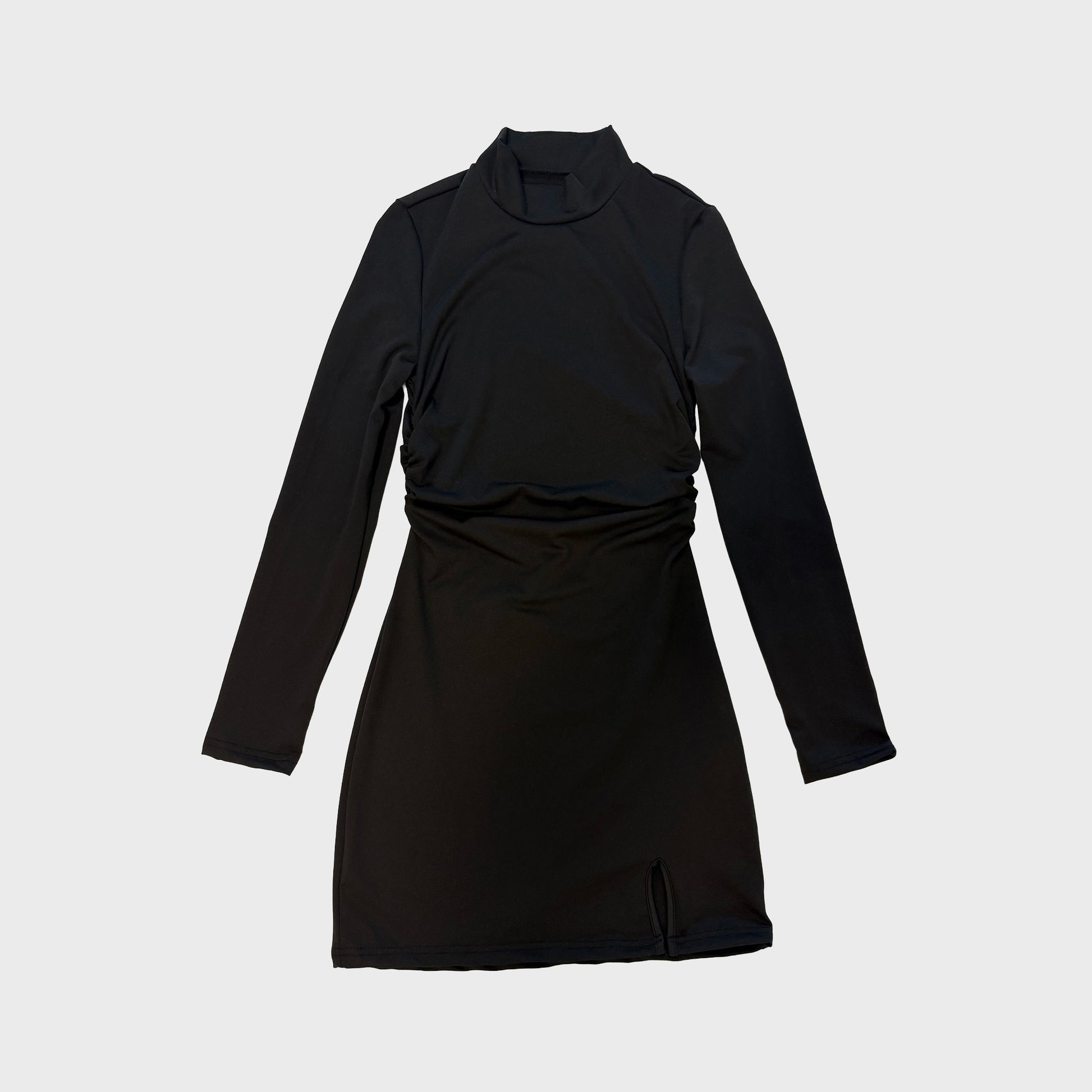 Este vestido negro arruchado a los lados es una prenda imprescindible para tu guardarropa. Su diseño combina elegancia y estilo para cualquier ocasión.